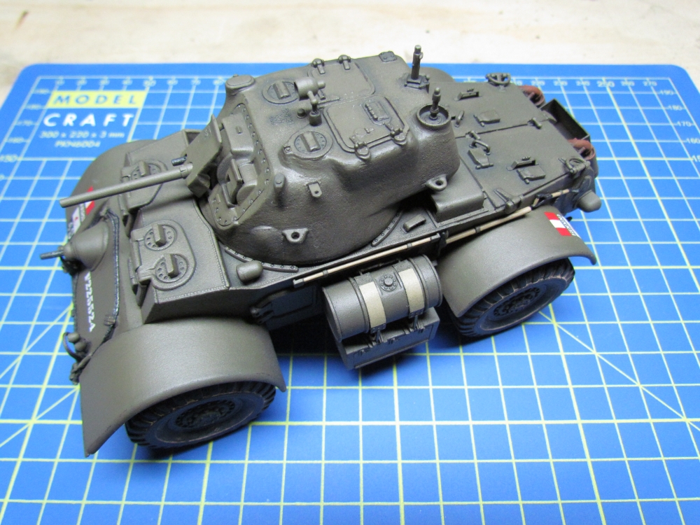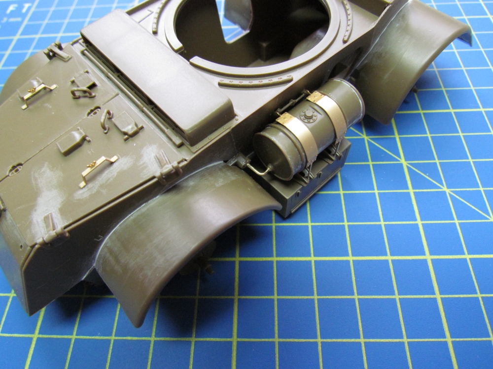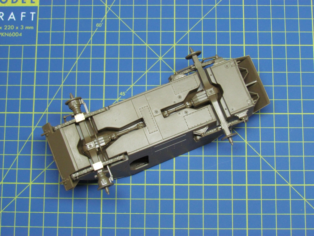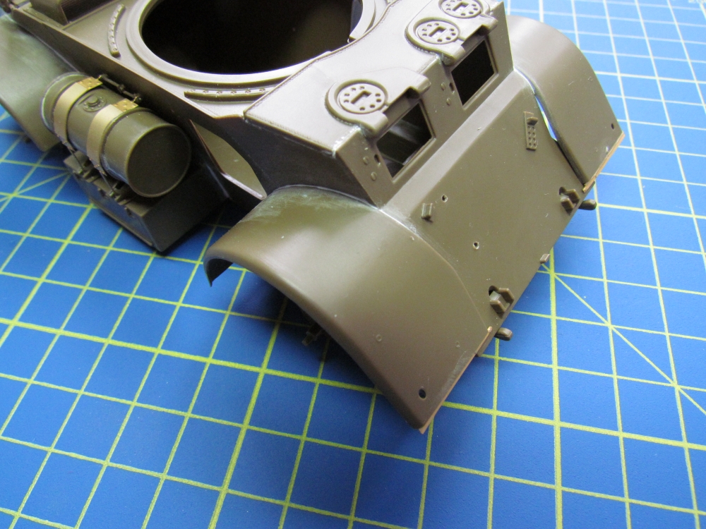 As usual, primer was sprayed on first. At the time of writing I am having an “issue” with primer, which I am finding quite annoying and frustrating! Basically it is giving me an excessively rough, almost gritty, finish. My friend describes a similar experience here. Indeed, it has already caused me to discard a fully assembled model, a Cromwell tank, when this happened earlier this year. I thought at the time that it was due to me insufficiently shaking the can. For this model I made sure that the can was well shaken and yet I found the same thing happening, although not as bad and not all over. Also, I was sufficiently alert to notice it this time (with the Cromwell I had actually moved onto the base coat before I decided the finish was unacceptable, which is too late to do anything about it). So, use of fine sand paper and even a scalpel got it back to a decent finish and the model could proceed! I understand that matt paint is by nature a rougher finish than gloss/semi-gloss/satin paint and that occasional use of fine sand paper is needed but this seems excessive to me.