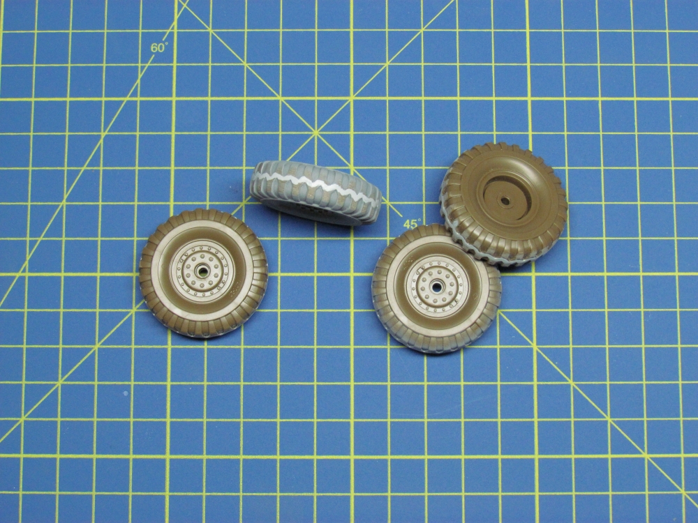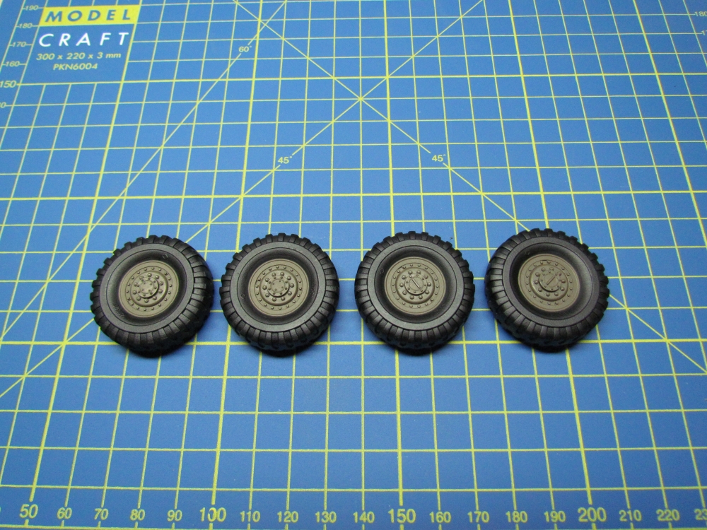A general wash and then a pin wash was done with a dilute mixture of Winsor and Newton Lamp Black and Raw Umber. Mig pigment (Dry Mud) was brushed into the tread of the tyres and then fixer was added. A mixture of pigment and fixer was then flicked from the end of a brush onto the underside and lower sides of the hull.