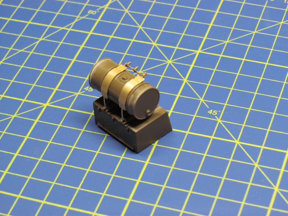 The extra fuel tanks include nice photo etch pieces. The pipe connecting into them appeared to be too short, so I improvised with brass wire. I managed to make a bit of a mess of one of the bolts that hold up the fuel tanks and it called for that shoddy tactic of using an item of stowage to disguise it!
