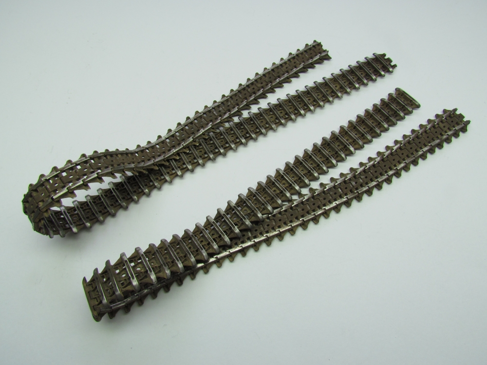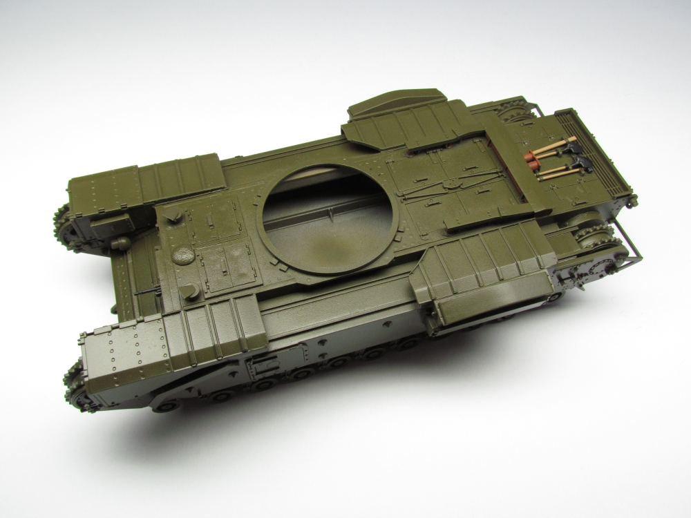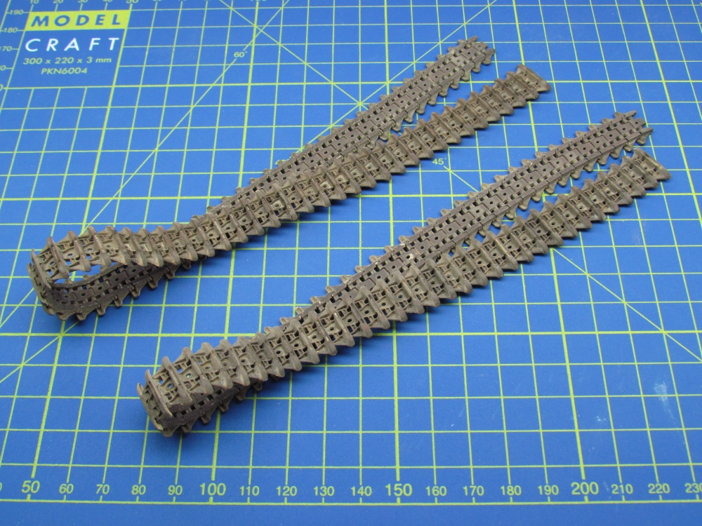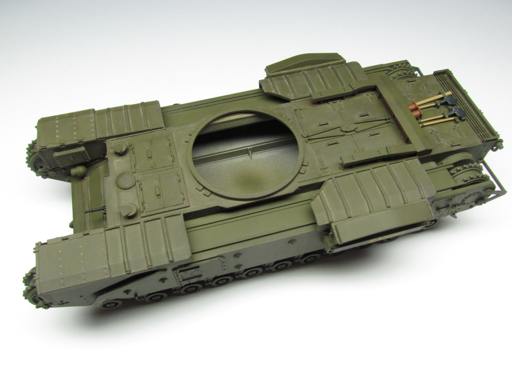 The Churchill tracks are especially prominent so there was no question of not using the Friulmodel metal ones. They were treated in the usual manner – burnishing with Blacken-It, multiple washing with a mixture of Winsor and Newton Raw Umber and Burnt Umber in white spirit and application of Mig Productions Dry Mud pigment with pigment fixer sprayed on to seal it. I then rubbed sand paper over those parts of the tracks which would be in contact with wheels or ground to show the exposed metal.