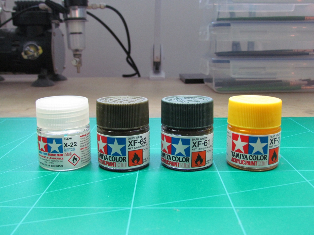 - Base coat: A mixture of 80% Tamiya acrylics (ratio 5 parts XF-61, 2 parts XF-62, 3 parts XF-3) and 20% Tamiya X 22 Clear in Tamiya X-20A thinner (ratio 2/3 paint mixture to 1/3 thinner).