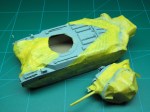 This camouflage scheme – which I believe is called the “Caunter scheme” – necessitated the use of a vast amount of Tamiya masking tape, the progress of which is shown in the pictures. I must confess that about half way through this process I was regretting not selecting one of the simpler Matilda colour schemes! Still, I was pleasantly surprised by the outcome – no paint or small parts torn away by removing the tape. That stuff is awesome. There was a small amount of paint bleed to be corrected. Now, what I ended up with is not remotely demonstration quality, but, viewed from a distance it will look OK! I am also quite sure that it is not exactly how the real scheme looked, in shape or colour. For once, I used exactly the paints which the Tamiya instructions recommended. I was aware that many people think that at least some of these suggested colours are “wrong”, perhaps the result of researching a particular museum vehicle which has been incorrectly repainted. Of course, grossly inaccurate colours are unacceptable but these days I am a little less concerned about matching what is deemed to be the exact base colour. I have in the past painted two tanks with the exact same base colour, only for them to have slightly different appearances in the end, due to differences in weathering. The effect of heavy weathering on the same vehicle is well described here. I must admit that I was not wholly sure how to paint the exhaust pipes emerging from the top of the vehicle and running to the back of it. The moulding on them suggests that they have some kind of covering on the pipes. For now, I have left them as the camouflage scheme, as the Tamiya artwork implies. If I find more convincing reference pictures I may well change it.