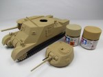 Base coat: A mixture of 80% Tamiya acrylics (90% XF-57 “Buff”, 10% Tamiya XF-59 “Desert Yellow”) and 20% Tamiya X-22 Clear in Tamiya X-20A thinner (ratio 2/3 paint mixture to 1/3 thinner).