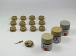 Base coat: A mixture of 90% Tamiya acrylics (XF-59 “Desert Yellow”, XF-57 “Buff”, XF-19 “Sky Grey” in a 4:1:1 ratio) and 10% Tamiya X-22 Clear in Tamiya X-20A thinner (2/3 paint mixture to 1/3 thinner) [1]. For the second coat I lightened it a little bit with a ratio of XF-59:XF-57:XF-19 of 3:2:1.