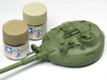 - A 1:1 mixture of Tamiya Acrylic XF-57 “Buff” and Tamiya Acrylic XF-52 “Flat Earth” in Tamiya X-20A thinner (10% paint mixture to 90% thinner) was sprayed on the underside, wheels, selective parts of upper hull and turret.