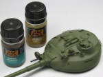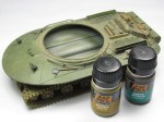 Normally I don’t go in for “excessive” weathering with a mud effect. But in this case I thought I would make an exception. So, I mixed a 3:2 solution of AK Interactive’s “Summer Kursk Earth” wash (AK080) and “Earth Effects” wash (AK017) and added plaster of Paris until it was the consistency of cream. Balancing the vehicle on its various sides I splattered the mixture from the end of a brush with air from an airbrush onto the lower hull, wheels and tracks. For a very little splatter on the upper hull and turret I flicked the mixture from a small brush.
