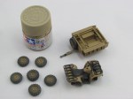 - Two lots of spraying of wheels, quad bike and outside of trailer with 10% Tamiya XF-57 “Buff” in Tamiya X-20A thinner. I think that this is fast becoming my preferred method for quickly and quite convincingly applying a dust\light earth effect.