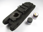 Base coat 1: A mixture of 90% Tamiya acrylics (XF-1 “Flat Black” and XF-10 “Flat Brown” in a 3:1 ratio) and 10% Tamiya X 22 Clear in Tamiya X-20A thinner (2:1 paint mixture to thinner). Sprayed over the entire vehicle. This was then followed with a similar mixture of Tamiya XF-62 “Olive Drab”, excluding the tracks and recesses.