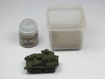 - A mix of “medium” colour pigments was added by brush to the tracks, running gears and select parts of the hull and turret. Fixing was achieved by a light spray of Tamiya X-20A thinner. Later, a slurry of the same ingredients was made up and flicked from the end of a brush to create splash effects.