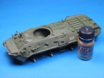 - Streaks of AK Interactive “Dark Streaking Grime” (AK024) were applied to the turret, hull upper sloping sides, hull front and hull back, followed later by blending with white spirit.