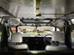 I have been driving the Defender for a couple of months now with the metal roof (and various wires) exposed – the original internal ceiling was fairly worn and discoloured, ripe for renewal. But first, with winter approaching, it seemed to us to be a good idea to insulate the roof. This stuff – foam backed on one side by foil and on the other by self-adhesive tape – seemed to fit the bill. A few hours later and it was all done, ready for the installation of the headliner.
