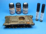 - Mig Productions 502 Abteilung “Olive Green” ABT050, “Faded Grey” ABT100, “Basic Earth” ABT093 and “Faded UN White” ABT165 and AMMO Oilbrusher “Starship Filth” (A.MIG-3513) were added in dots to various parts of the vehicle, later blended in with enamel thinner.