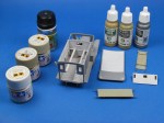 - Following spraying of Tamiya “Fine Surface Primer” (light grey), I sprayed the floor and other parts with a mixture of 90% Tamiya “Deck Tan” (XF-55) and 10% Tamiya X-22 Clear in Mr.Color Leveling Thinner (1:2 paint:thinner). Once dry, AK Interactive “Worn Effects” (AK088) was painted with a brush in two coats, about an hour apart, to the areas previously spray painted. An hour later a 1:2 mixture of Tamiya “Flat White” (XF-2) and Mr.Color Leveling Thinner was sprayed over the entire interior, to be repeated an hour later.