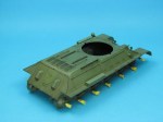 The vertical and sloping sides of the upper hull and turret were dampened with enamel thinner and then dots of AMMO Oilbrusher “Starship Filth”, “Starship Bay Sludge” and “Rust” were added. Then, using a flat brush, the oil paint was drawn down the side to simulate streaks. After drying, this process was repeated multiple times.