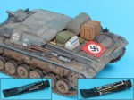 - Mixtures of Abteilung 502 “Engine Grease” (ABT160) or “Bitumen” (ABT004) oil paint in enamel thinners – in varying concentrations – were added to various parts of the engine deck, transmission hatches, running gear and fuel drum and oil can to represent stains.
