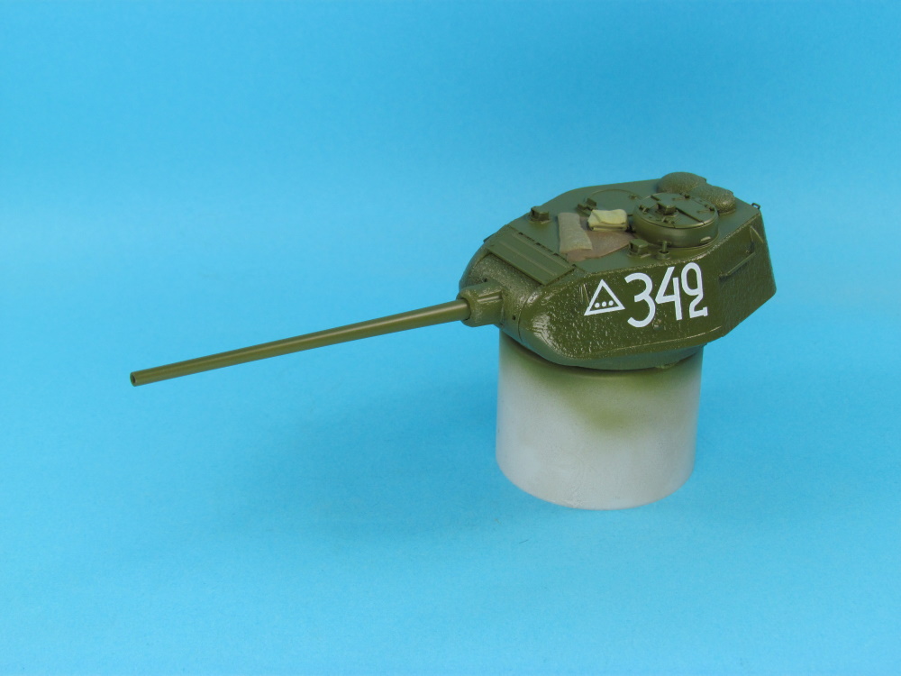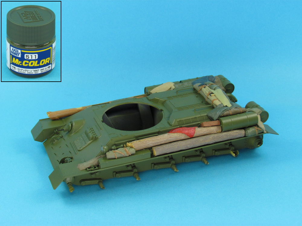 Basecoat: A 1:2 mixture of Mr.Color “Russian Green 4BO” (511) and Mr.Color Leveling Thinner. This is a new paint for Russian WWII AFVs and I think I prefer it to their previous attempts – I can see me using it repeatedly in the future.