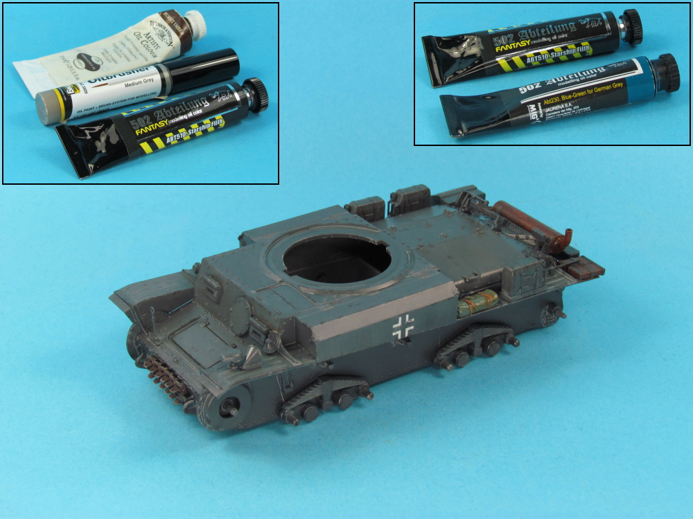 - Abteilung 502 “Engine Grease” (ABT160) oil paint, in varying dilutions in enamel thinners, was added to parts of the vehicle, to simulate oil and fuel stains.