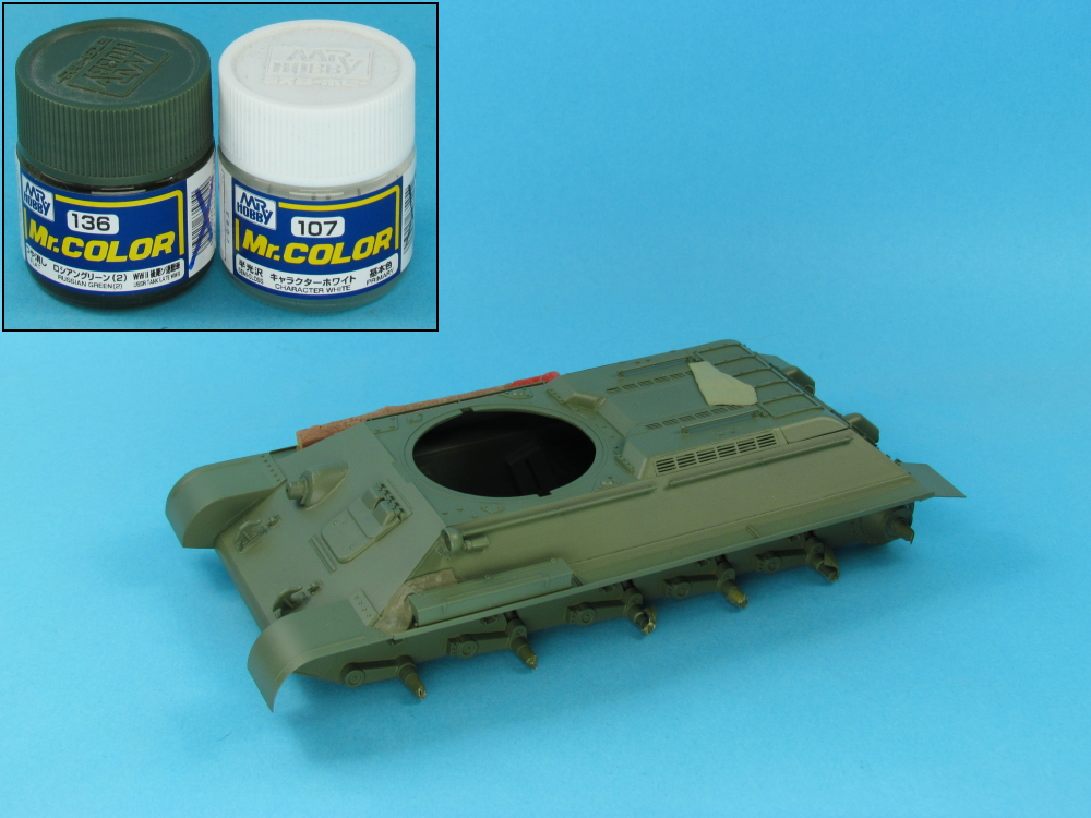 Basecoat: A 1:2 mixture of Mr.Color “Russian Green (2) – USSR tank late WWII” (136) and Mr.Color Leveling Thinner was sprayed all over. Then, a 3:1 mixture of Mr.Color “Russian Green (2) – USSR tank late WWII” (136) and Mr.Color “Character White” (107) in Mr.Color Leveling Thinner (1:2 ratio of paint mixture to thinner) was sprayed on the upper parts.