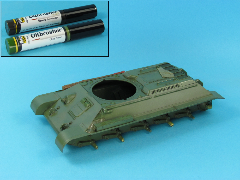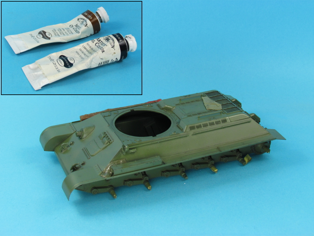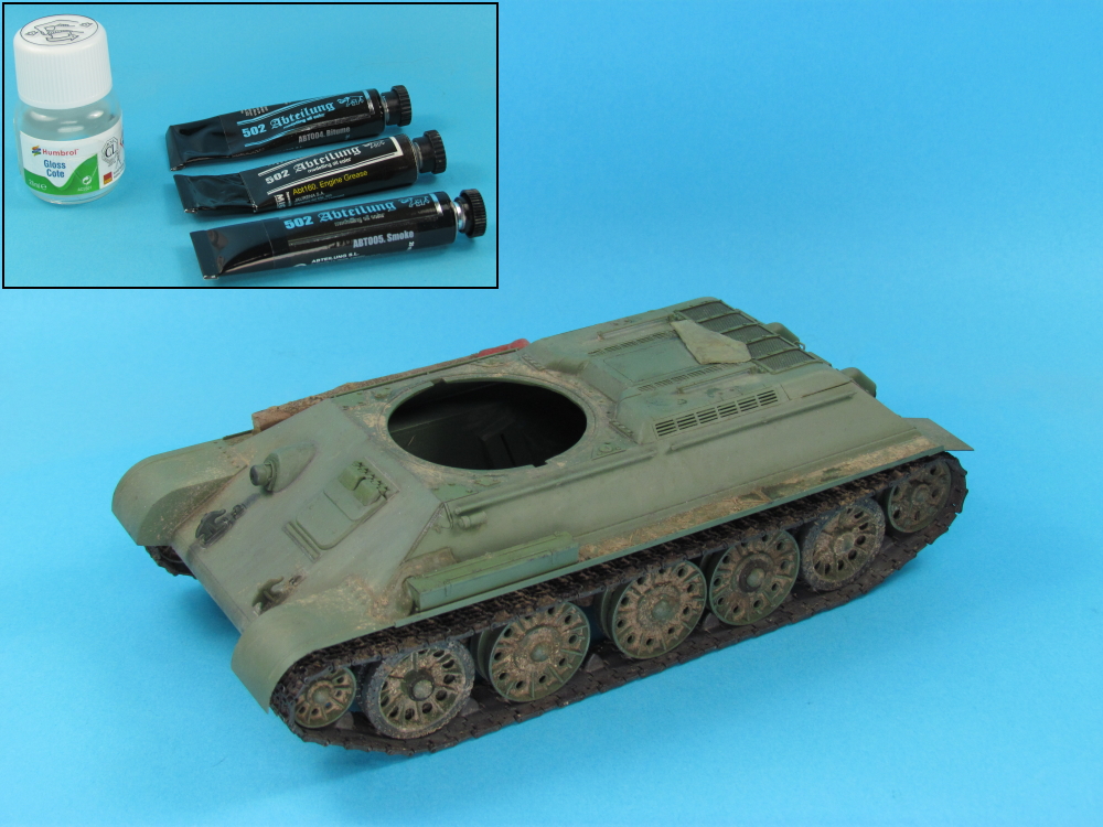 - Abteilung 502 “Smoke” (ABT005), “Bitume” (ABT004) and “Engine Grease” (ABT160) oil paints, in varying dilutions in enamel thinners and with or without Humbrol “Gloss Cote”, were added to parts of the vehicle, to simulate oil and fuel stains. To simulate newer stains, Humbrol “Gloss Cote” was added to the mix.
