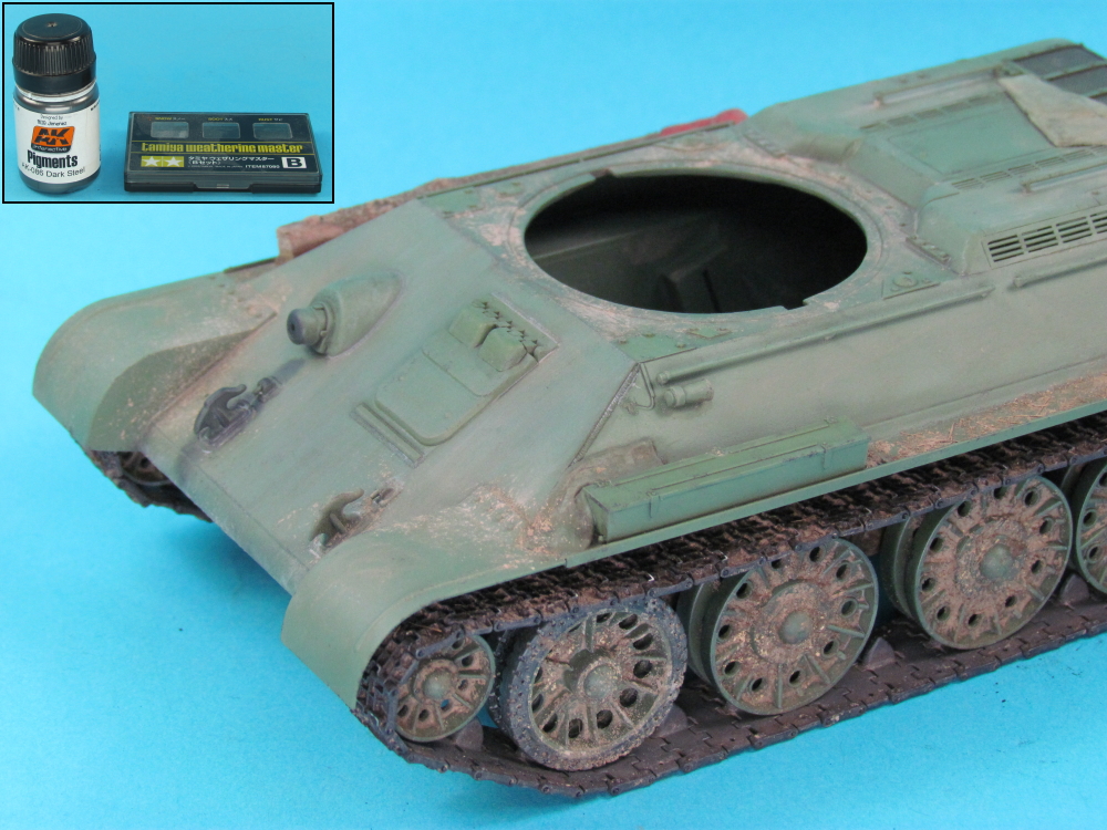 - The contact points on the tracks, idler and sprocket wheels were brushed with with AK Interactive “Dark Steel” (AK086) pigment.
