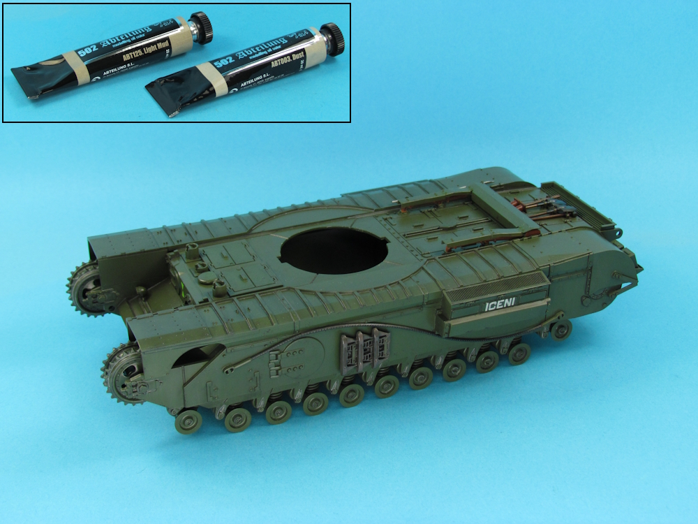 - Wilder pigments “Dark European Terrain” (GP09) and “Dry European Mud” (GP08) were brushed onto the surfaces and then treated with a 1:1 mixture of AMMO “Pigment Fixer” (A.MIG-3000) and enamel thinners, applied by brush. Once dry, oversized bits were removed. For reference, I used “Churchill Tank 1941-1956 (all models) Owners’ Workshop Manual” (Haynes Publishing, 2013), especially the pictures on pages 35 and 135 which seemed to show significant dirt and debris on the hull of the tank.
