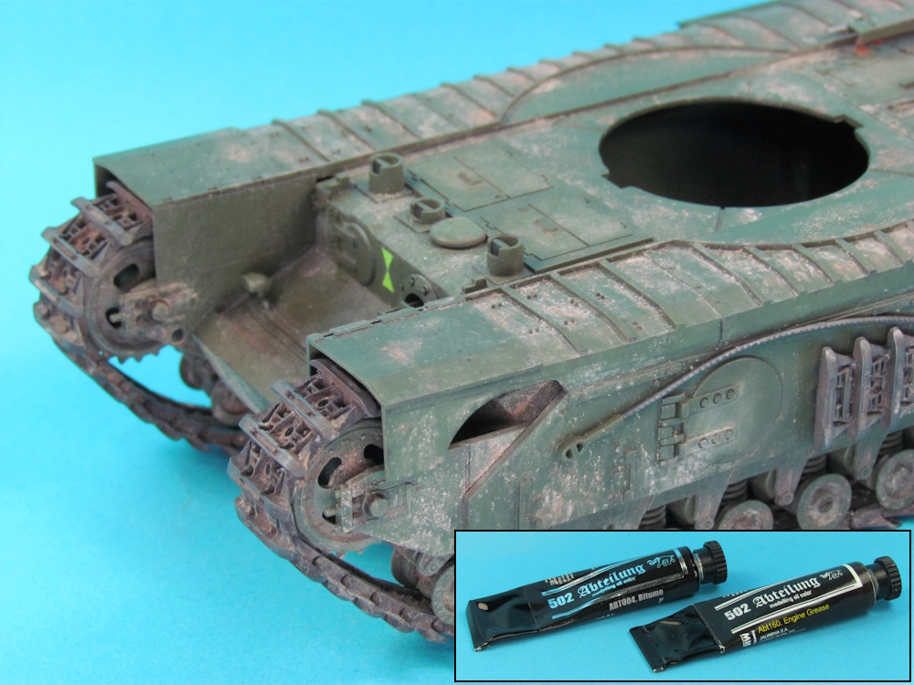 - Abteilung 502 “Bitume” (ABT004) and “Engine Grease” (ABT160) oil paints, in varying dilutions in enamel thinners and with or without Humbrol “Gloss Cote”, were added to parts of the vehicle, to simulate oil and fuel stains. To simulate newer stains, Humbrol “Gloss Cote” was added to the mix.