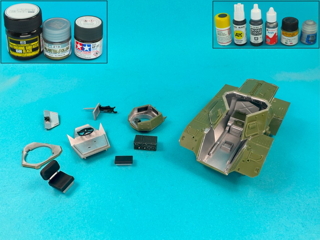 I chose to pose the most important hatches open, which obviously means that I had to paint the inside before finishing the assembly. For this, following primer, I used a metallic colour to simulate the silver colour of the interior. Details (seats, machine gun, Larkspur radio set) were added with appropriate colours. Overall a good build – I am sure one or two pieces will look more authentic as photo etch, and there is potential for other upgrades, but that is for another time.
