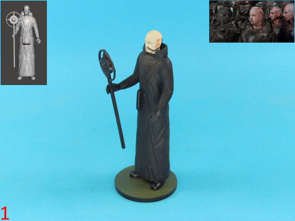 - No.1. First up is a First Stage Guild Navigator from Dune. Actually it is the design from the 1984 film, which certainly has its faults but I have always liked it for the cast, art, effects and music. This figure is – I presume – 3D printed in the style of the Kenner figures. Fairly easy to paint, as it is basically one colour. I brushed some “spice” coloured pigment on the overall, as it seems that he has a messy front in the film!