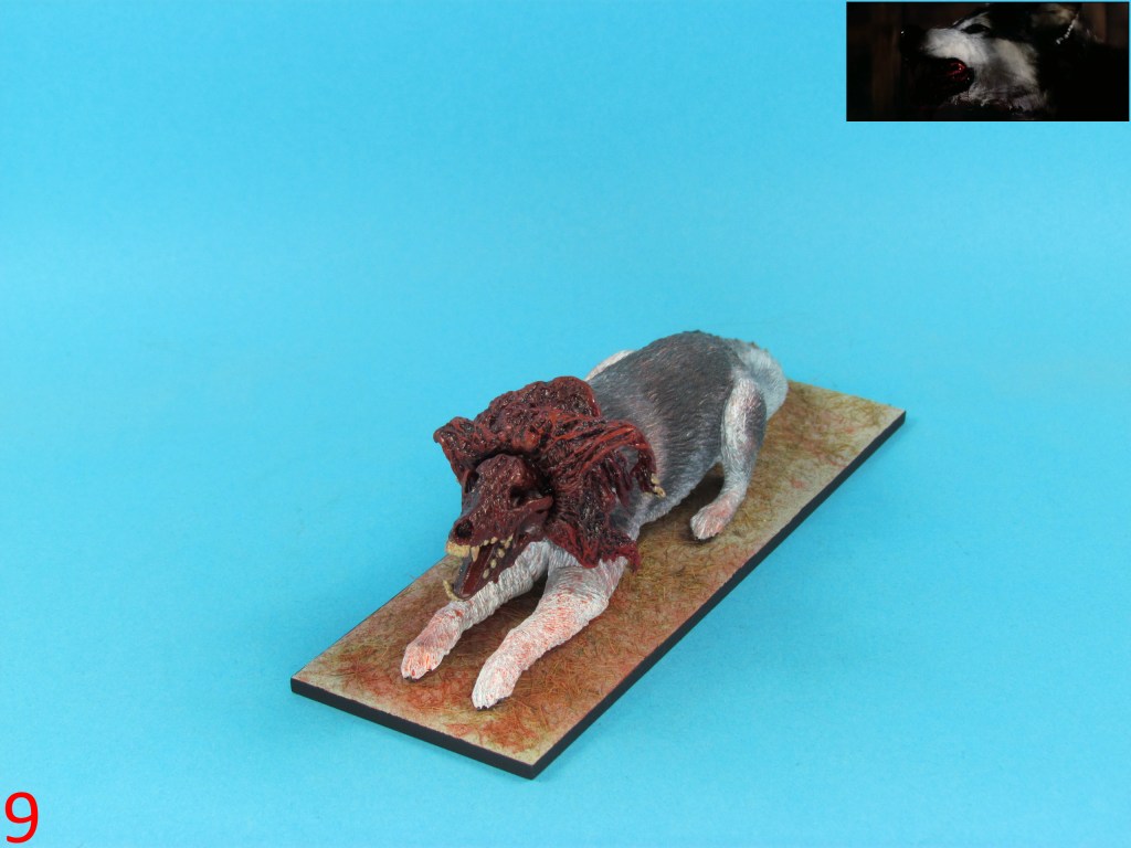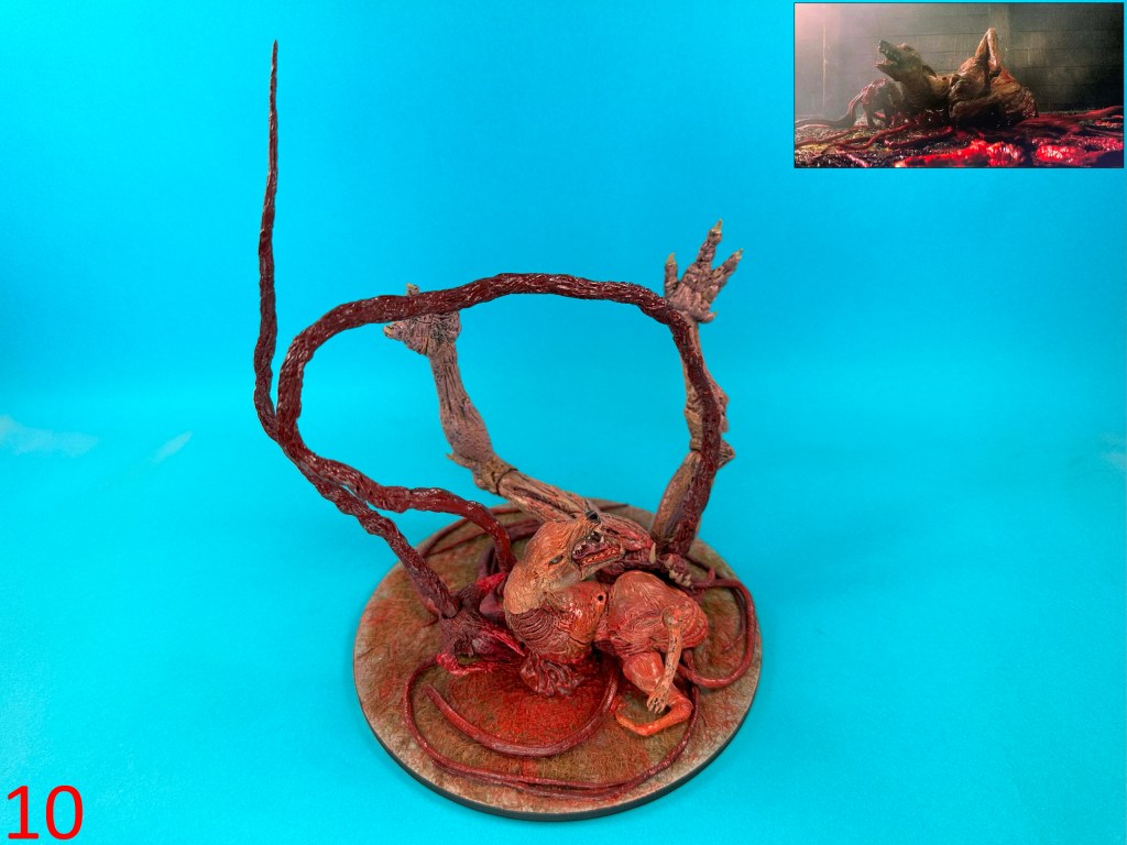 - No.8-11. I didn’t paint these. They are an figure memorabilia set from Neca, with the subject being various manifestations of the creature from The Thing film of 1982. It comes in various forms, from the dog before it begins transformation to the final form before it escapes from the base kennel. This is what I have here. Simple bases were created with texture paint and chopped up dried grass, to simulate the hay spread on the kennel floor in the film. For the later creature I had to glue everything down otherwise it would topple over and add plentiful blood splatter.