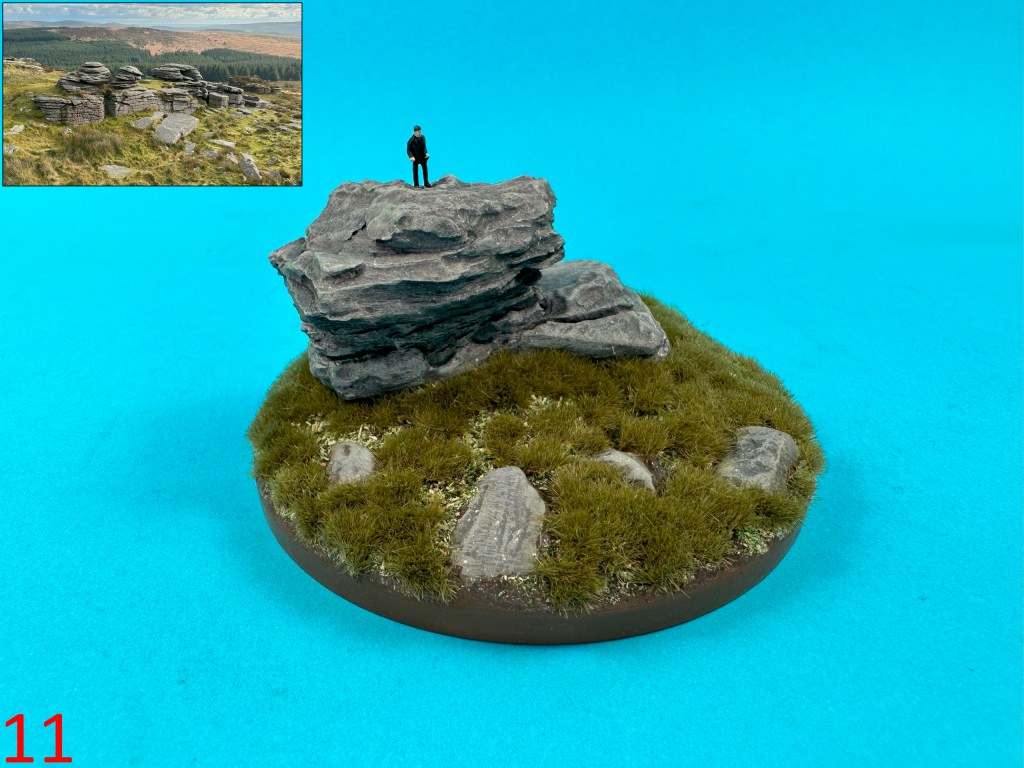 - No.11. As mentioned above, my visit to Dartmoor was somewhat inspiring – a stunning landscape. I thought I would try to recreate a small scene from it – a Tor. I reckoned that the bark pieces which I had previously used would look suitable as a granite rock outcrop when stacked up and suitably painted. To this was added smaller stone outcrops and various bits of vegetation. If you know The Hound of the Baskervilles you will recall the part where Holmes is spotted on top of a tor. I thought I would add such a figure – 1/150th scale – to give it a bit more interest. I quite like this one, a kind of home made souvenir of my visit.
