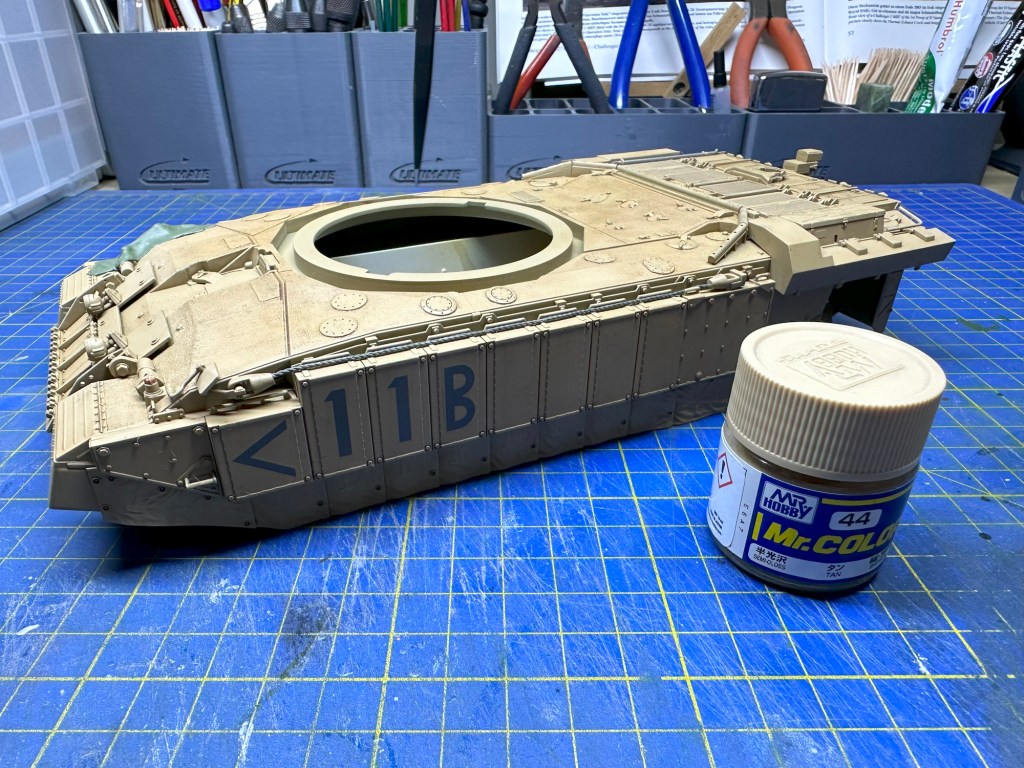 - The tracks, wheels and hull was spray with a 5% solution of Mr.Color “Tan” (44) and Mr.Color Leveling Thinner.