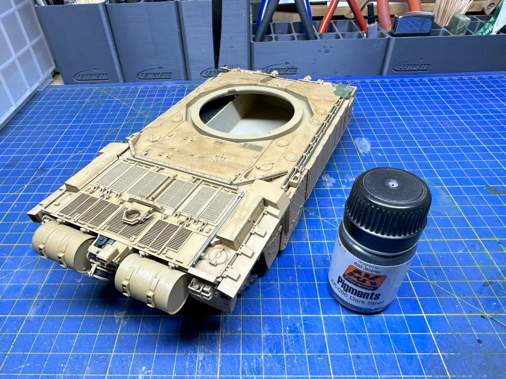 - The tracks, wheels and hull were brushed with AMMO “Sand” pigment.
