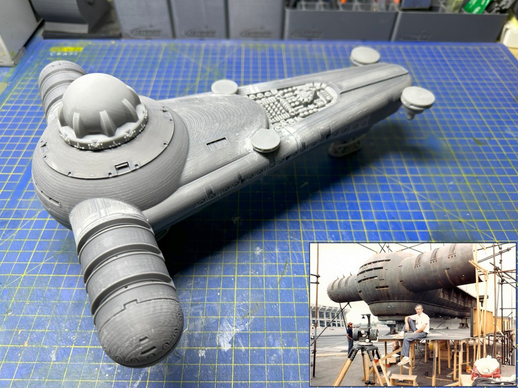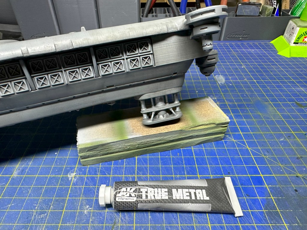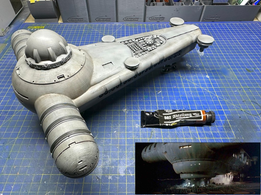 Another Dune model, but the fact is that I always liked the designs in the film, whatever its shortcomings are. This one – from this seller – is 3D printed in large parts to be assembled. It makes for an imposing model and I was happy with it. After that, it’s a case of painting with various grey shades and then weathering with oil paints, to represent the stains shown on the filming model. By the way, the scale of that is immense – that is what you call a model!