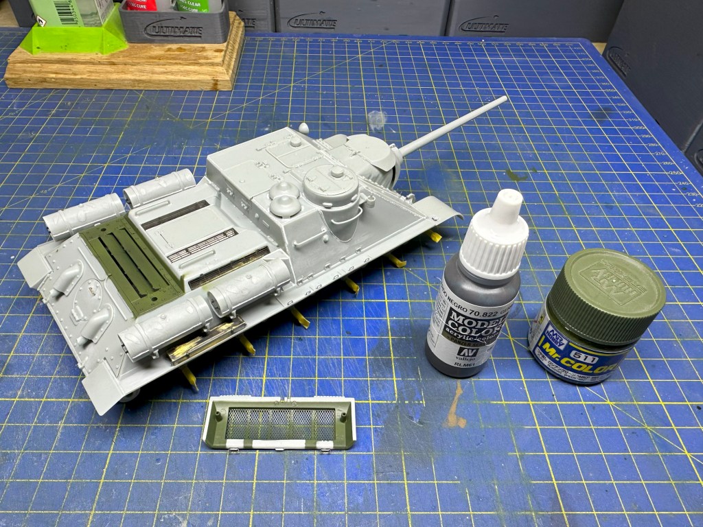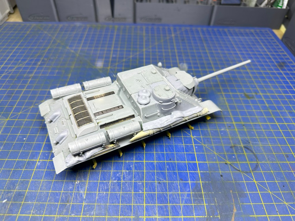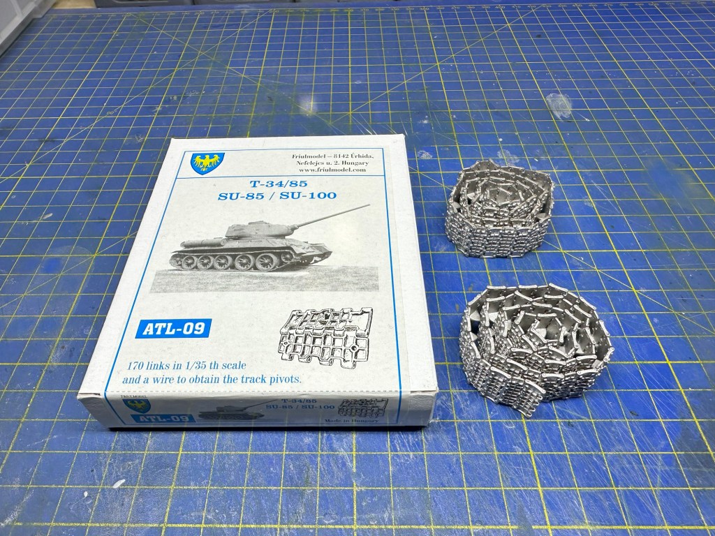 I think all the Dragon T-34s are basically fine, so it went together well. I used parts of the Eduard photoetch set (35724), particularly the engine bay grills and the handles. The tracks are the Friulmodel set (ATL-09) – 70 links per side – as well as for the spare tracks mounted on the front of the hull. I added an unditching beam (a nice resin piece) and various items of stowage, sculpted from “green stuff” putty.