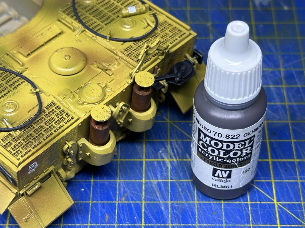 - Paint chips on the bare metal of the tank were simulated using Vallejo Model Color “German Camouflage Black Brown” (70822), applied with a sponge.