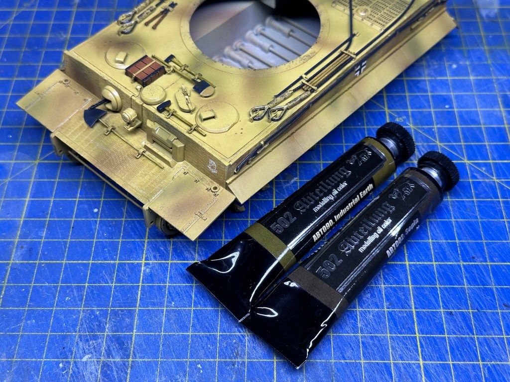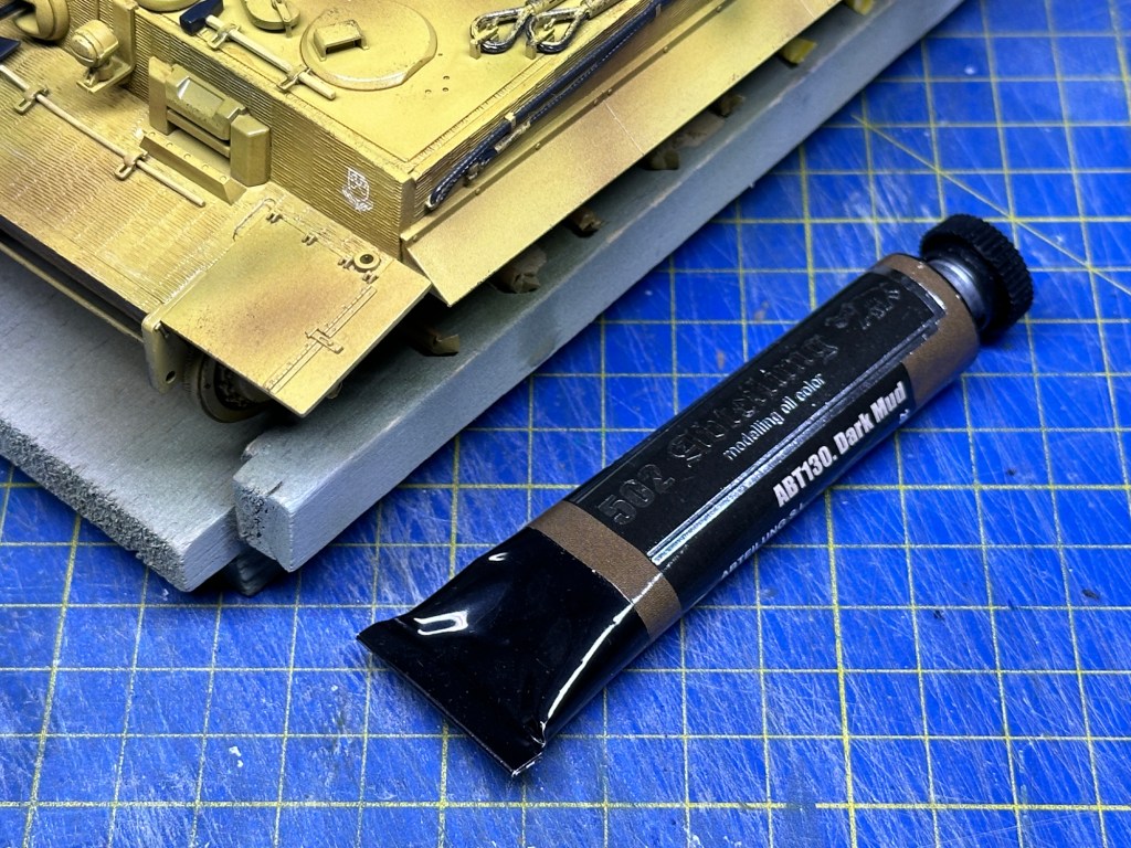 - The entire model was washed with a dilute mixture of Abteilung 502 “Dark Mud” (ABT130) oil paint in enamel thinners – the excess being cleaned up with a dry brush.
