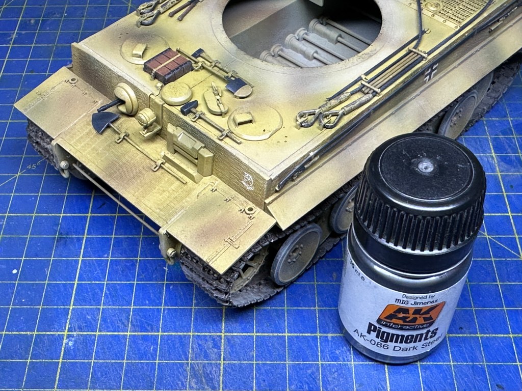 - AK Interactive “Dark Steel” (AK086) pigment was brushed on onto the metal tools, tow cable, machine guns and the end of the gun.