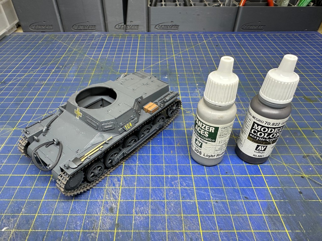 - Paint chips were simulated using Vallejo Panzer Aces “Light Rubber” (305) and Vallejo Model Color “German Camouflage Black Brown” (70822), applied with a sponge or fine brush.