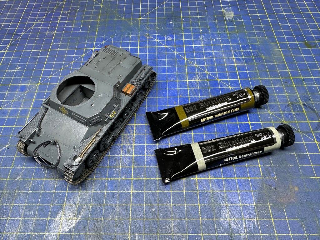 - To some of the vertical and sloping sides of the hull and turret, Abteilung 502 “Neutral Grey” (Abt100) and “Sepia” (Abt002) oil paint dots were added. Then, using a flat brush, the oil paint was drawn down the sides to simulate streaks of dirt or grime.