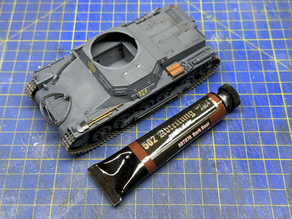 - Abteilung 502 “Engine Grease” (Abt160) and “Bitume” (Abt004) oil paints, in varying dilutions in enamel thinners, was added to parts of the vehicle, to simulate oil and fuel stains.