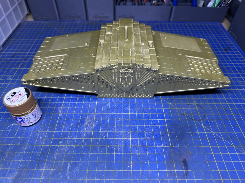 This is the Emperor’s ship, seen at the end of the Dune 1984 film. I bought the 3D print plans on Etsy and then them printed by a local company. I think that they did a good job – the parts were amongst the cleanest I have seen. As shown in the pictures, assembly and painting were easy, with no weathering. It’s a funny looking thing, but looks good next to my Harkonnen frigate – I need the Atreides one to finish the set now.