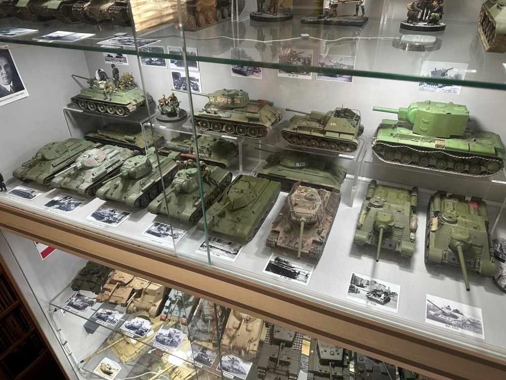 I have now made the two T-34 based tank destroyers (SU-85, SU-100), self propelled gun (SU-122), “tractor” and 11 76mm or 85mm gun tanks in 1/35th scale – two not shown in the picture above. Now that I have run out of space on the shelf, plus done any reasonable variant, I think that that will do for now!