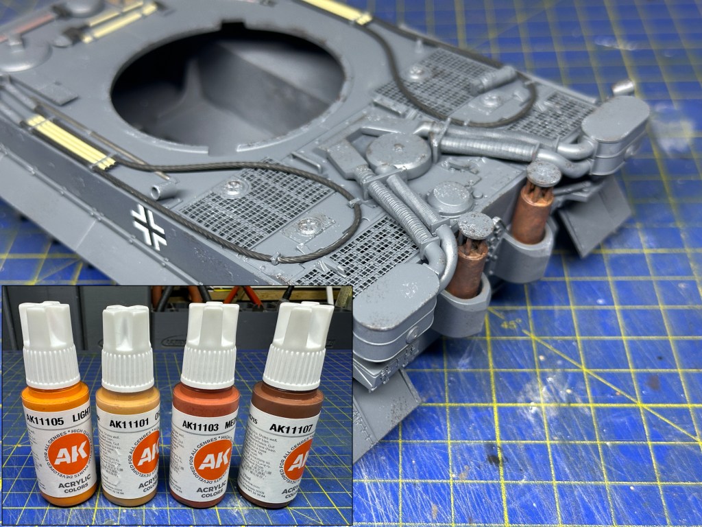 - The exhausts were painted with the various colours of the AK Interactive “Rust” set (AK11605).