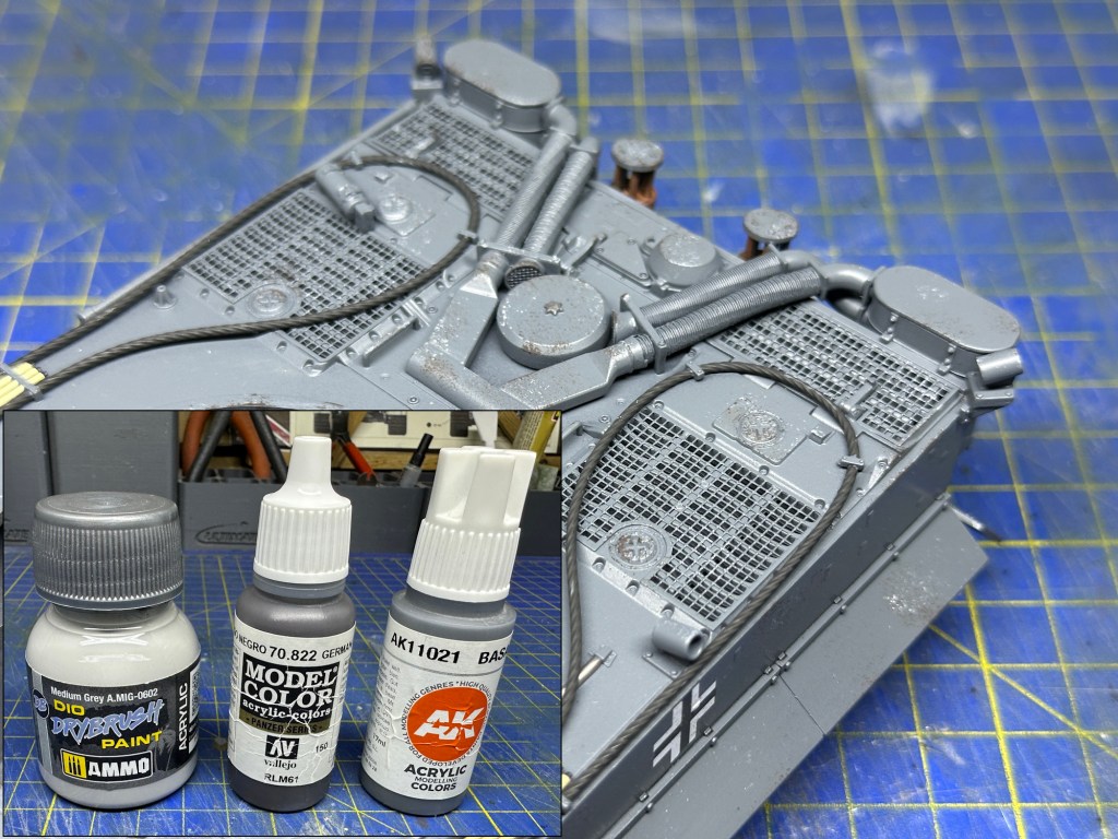 - Paint chips were simulated using AMMO “Medium Grey” (A.MIG-0602) and Vallejo Model Color “German Camouflage Black Brown” (70822).