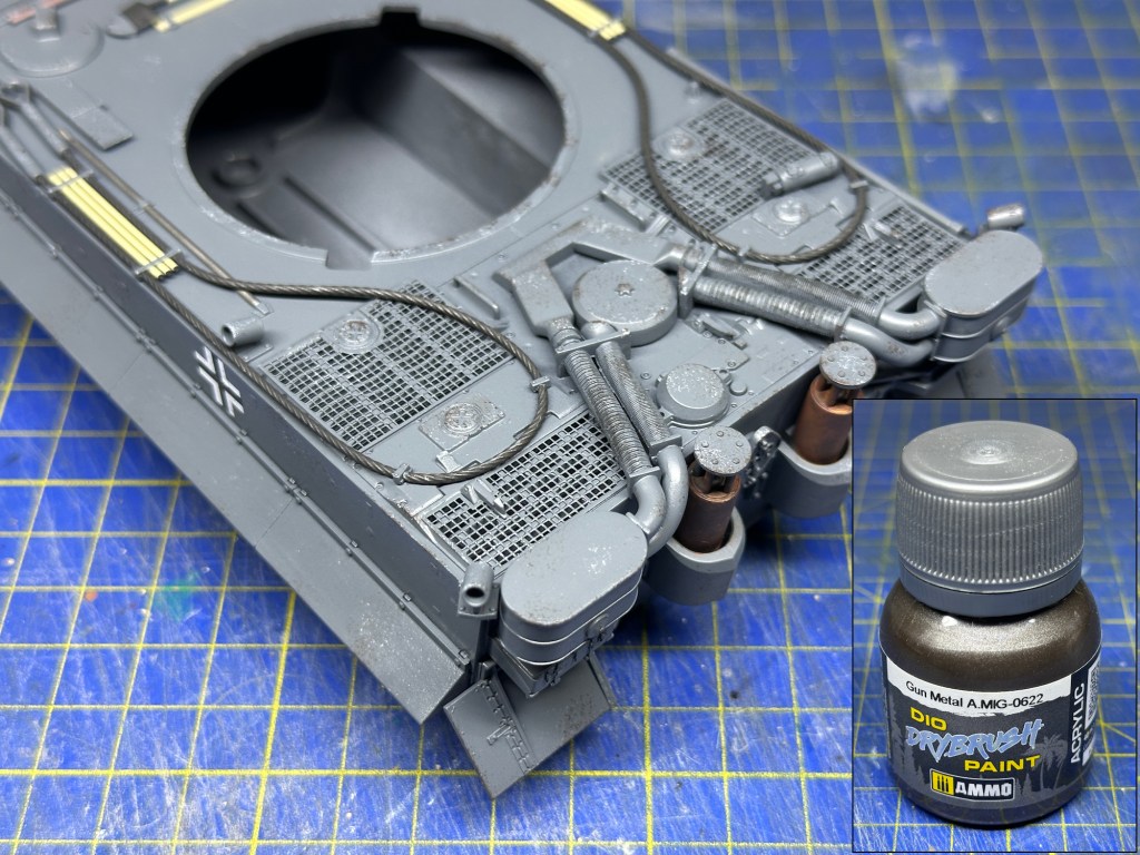 - The metal tools, and tow cables were dry brushed with AMMO “Gun Metal” (0622).