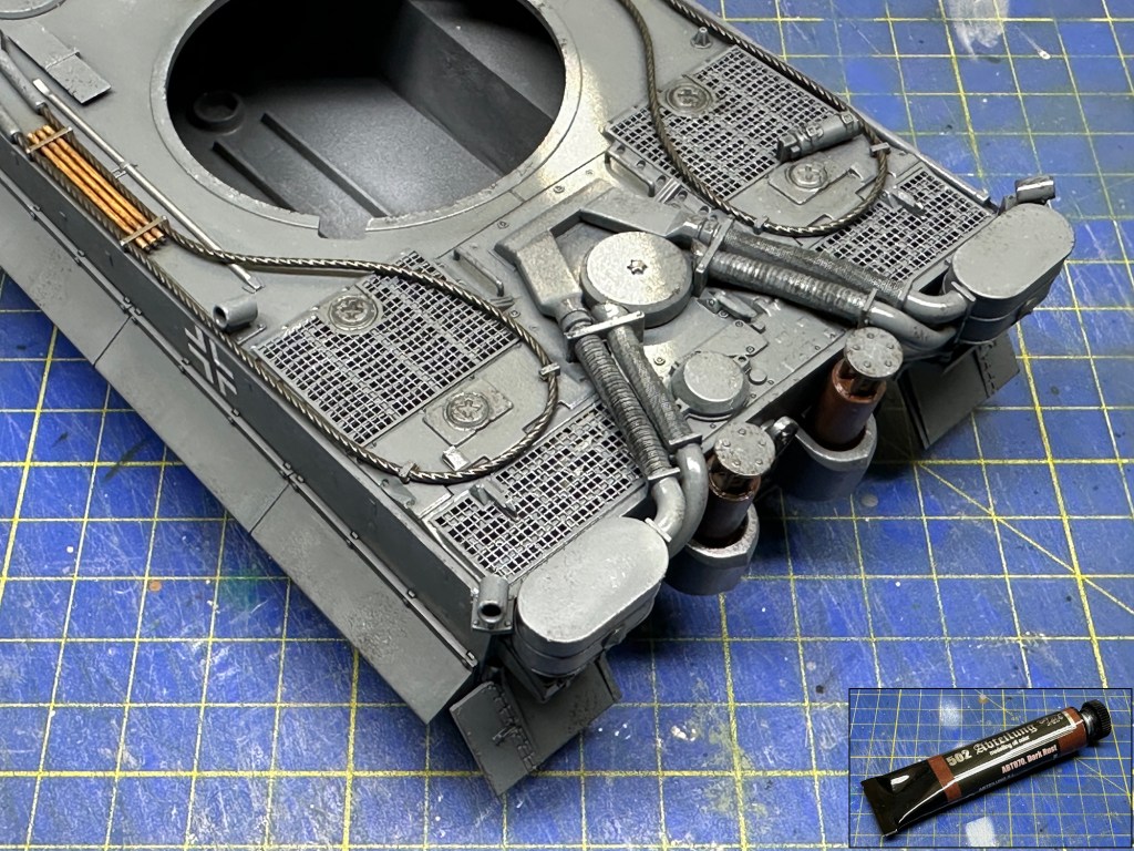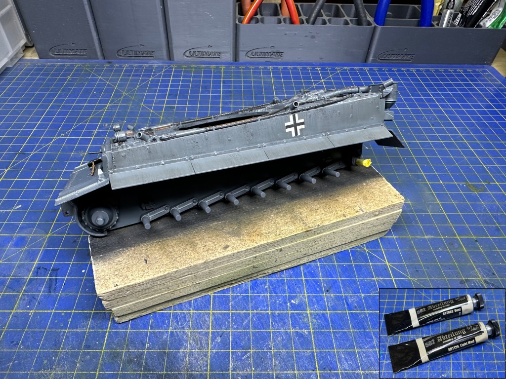 - To some of the vertical and sloping sides of the hull and turret, Abteilung 502 “Starship Filth” (Abt510) and “Sepia” (Abt002) oil paint dots were added. Then, using a flat brush, the oil paint was drawn down the sides to simulate streaks of dirt or grime.