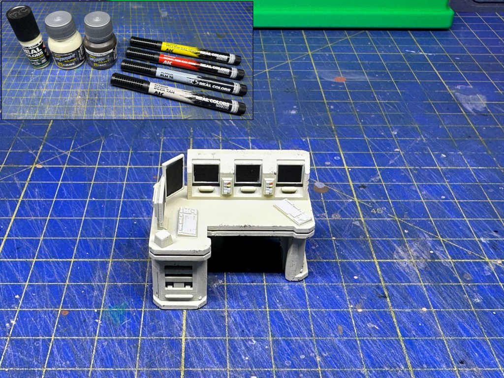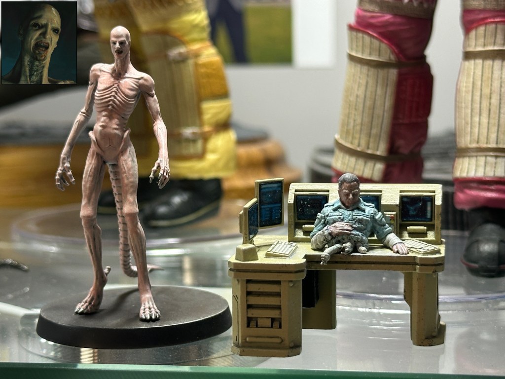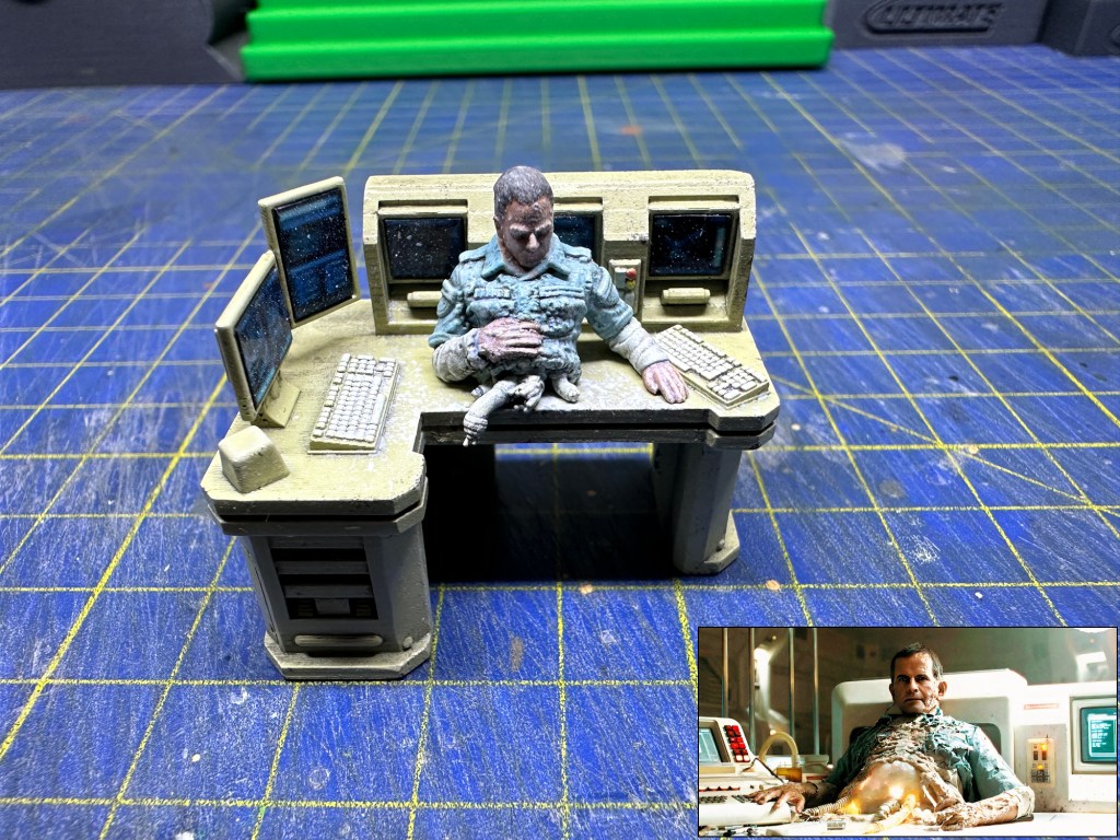 This time I have had a go at the 3D print – from a company called LV426 Designs – of the Ash-lookalike android called “Rook” from Alien Romulus. Anyone who has seen that film will know that when we see him he is less than whole – due to an encounter with the alien – and propped up on the console desk. It is a lovely item and I painted it as best I could from the film version. I used image grabs from this page – https://forresthogg.com/project/alien-romulus-ui – to prepare screens and scaled them down to fit in the printed parts. They look nice from a reasonable distance. Finally, I flicked white oil paint – mixed with gloss and thinner – onto the body and desk, to simulate android blood.