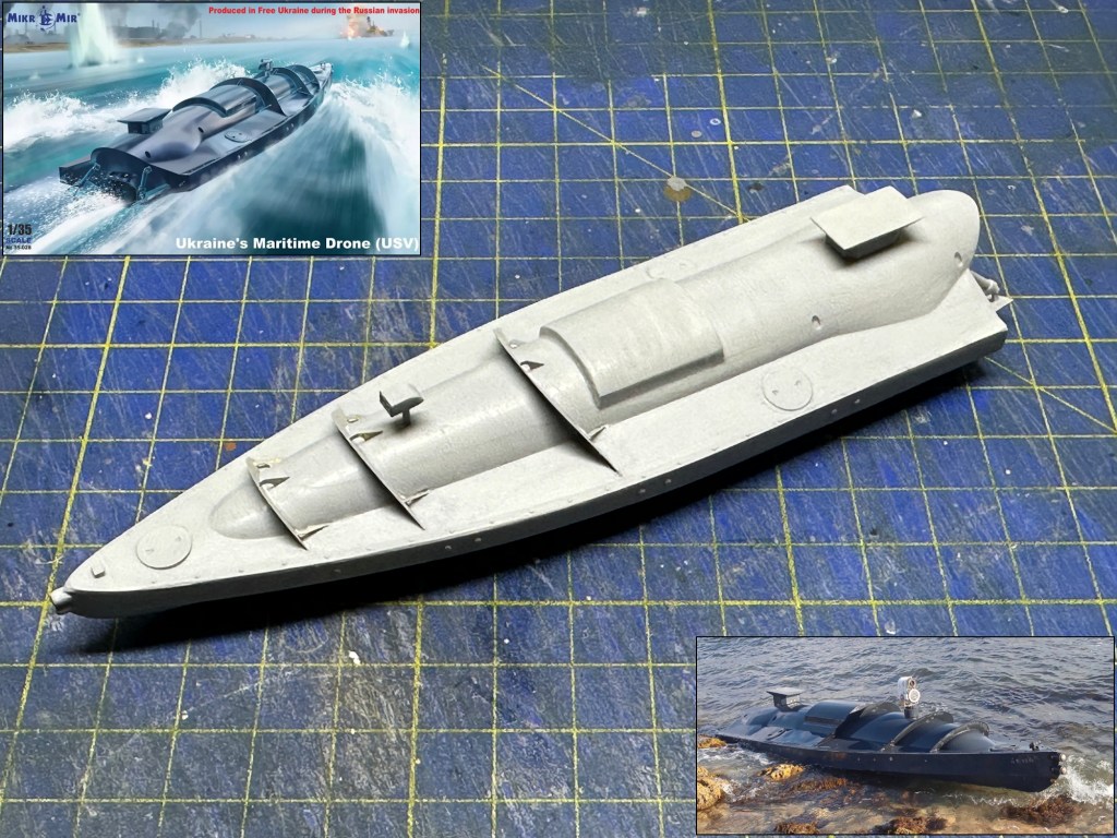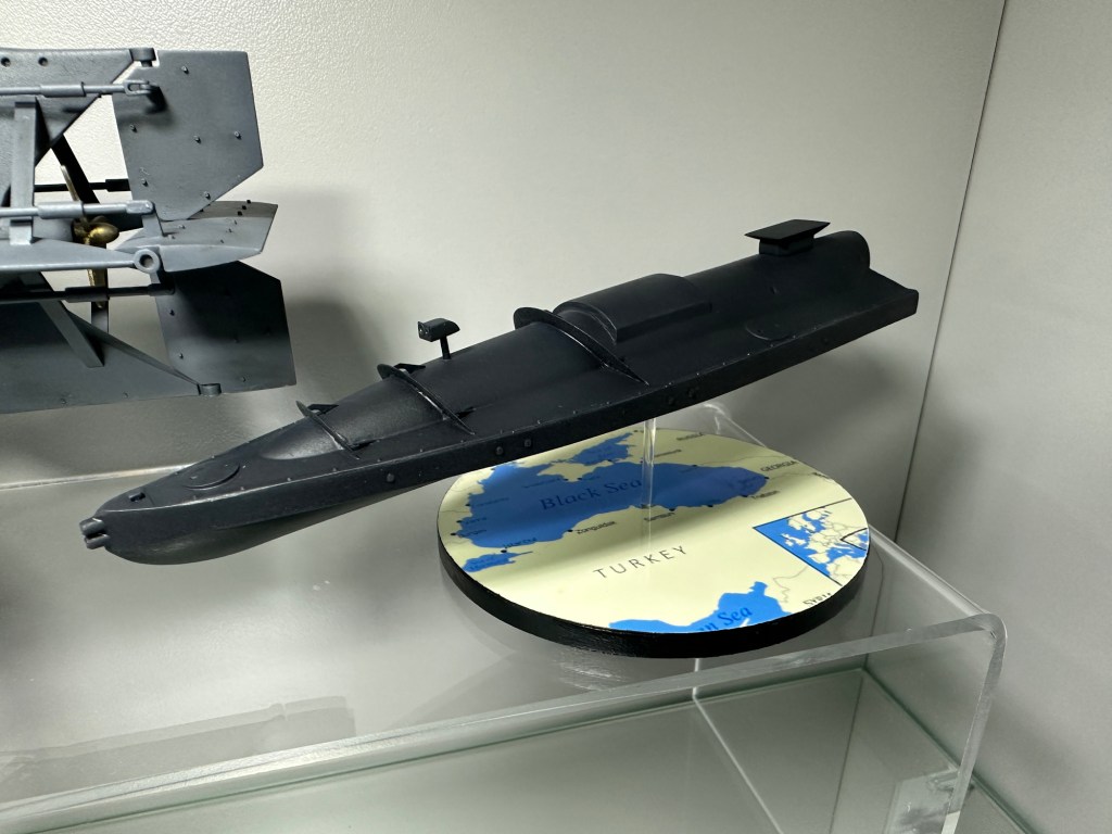 This kit – from a Ukrainian company called MikroMir – has been in an unfinished state with me for a while, so I decided to complete it. Construction is not complex, except for some small photo etch pieces. There were ridiculous attachments for the cameras or sensors which pop up on the bow and I replaced then with plastic or brass rod instead. Not accurate I suppose but one must be practical too. Painting was simple too, namely being shades of black! I mounted it on a base with a map of its operational area – the Black Sea.