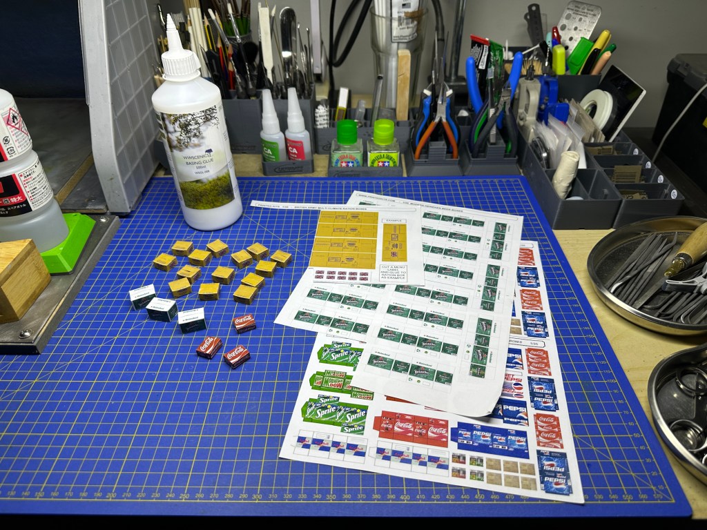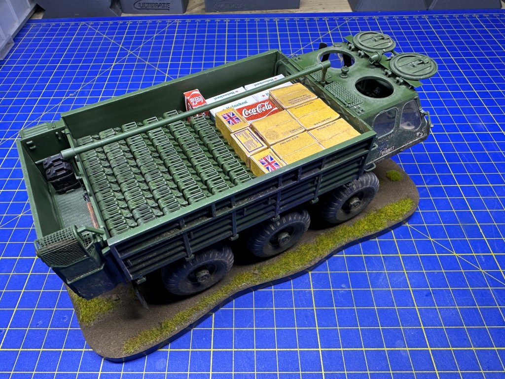 I like adding stowage items to vehicles. This one begged for something in the load area. I decided to go with a mix of jerry cans, ration boxes, plus a few drinks! The former were 3D printed items. The latter were paper prints, which were quite fun to construct. They were all glued into the load area.