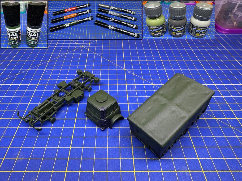 The NATO camouflage scheme was sprayed on and other paints applied, as shown above. The decals were then applied.
